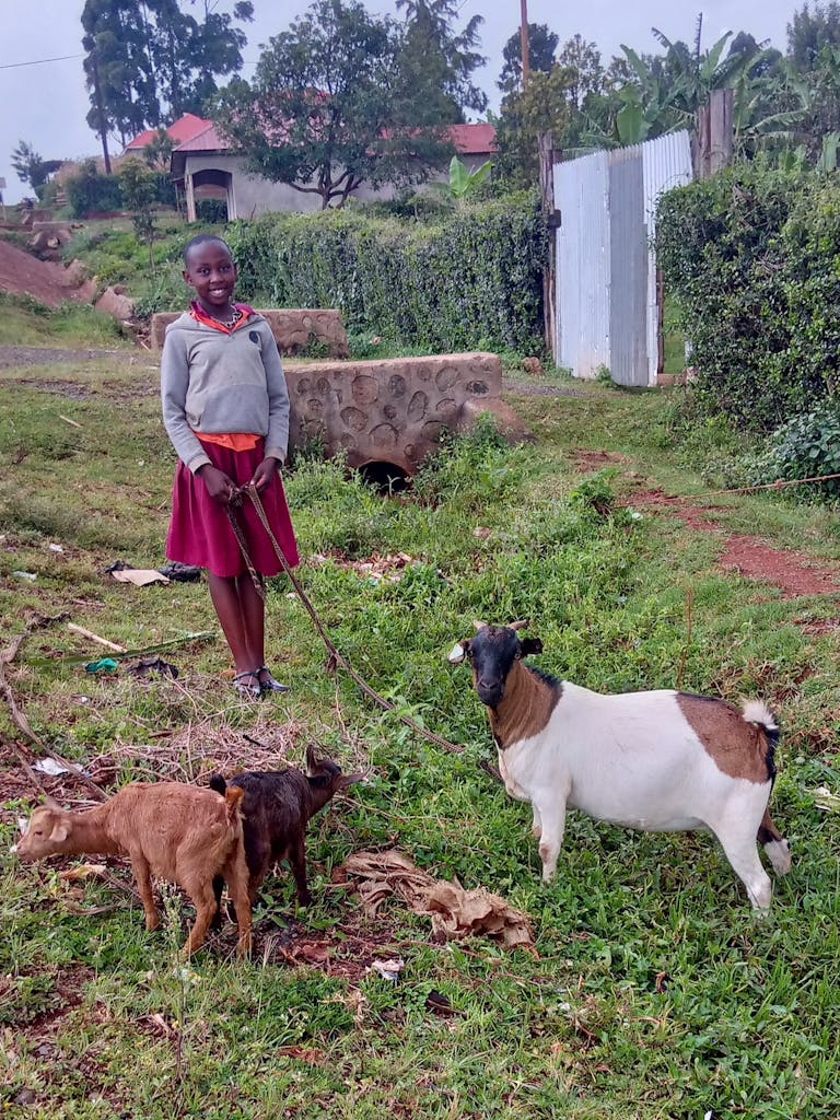 Young Grace says “I am thankful” that someone like you gave her “a goat that has now given birth to twin goats twice! I am confident that by the time I reach secondary level it would have multiplied three times, and my parents will sell and pay for my school fees. Here is me and my goats grazing.”